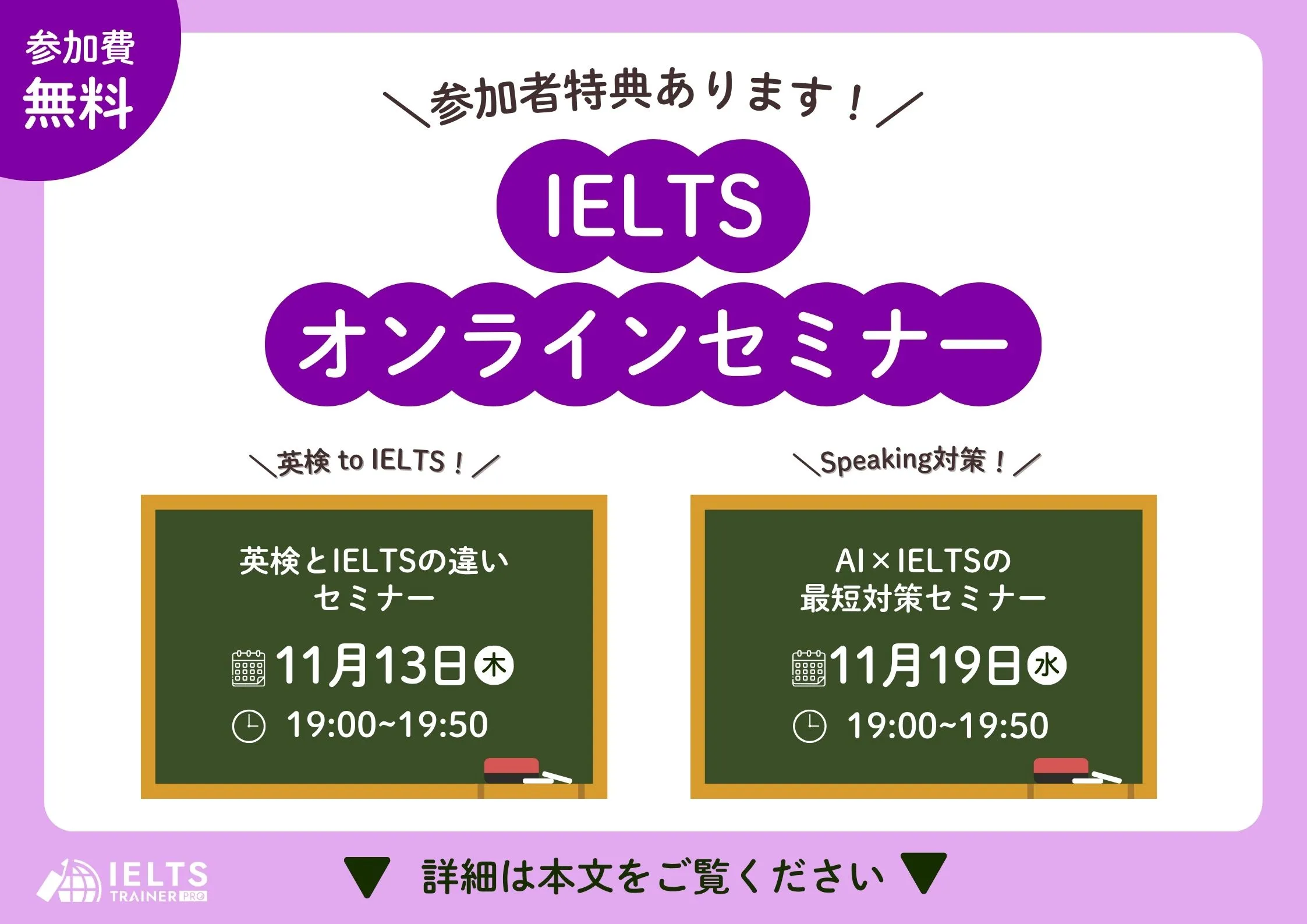 IELTS TRAINER PROでは11月も無料のIELTSオンラインセミナーを実施いたしますので、是非ご参加ください!
